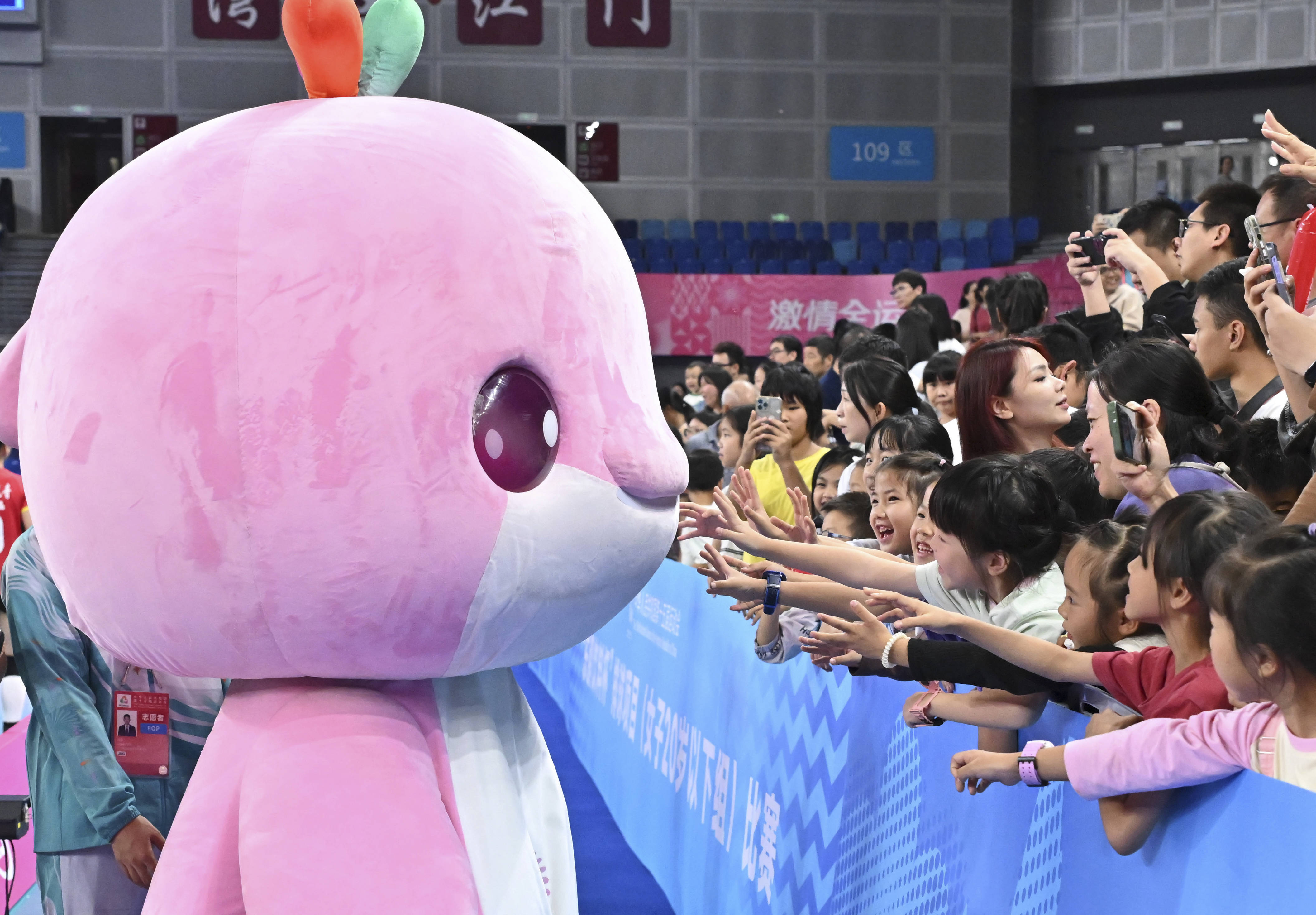 11月16日,吉祥物“乐融融”与观众互动。新华社记者 李鑫 摄聚人气顺民心,“苏超”“大湾鸡”受追捧
