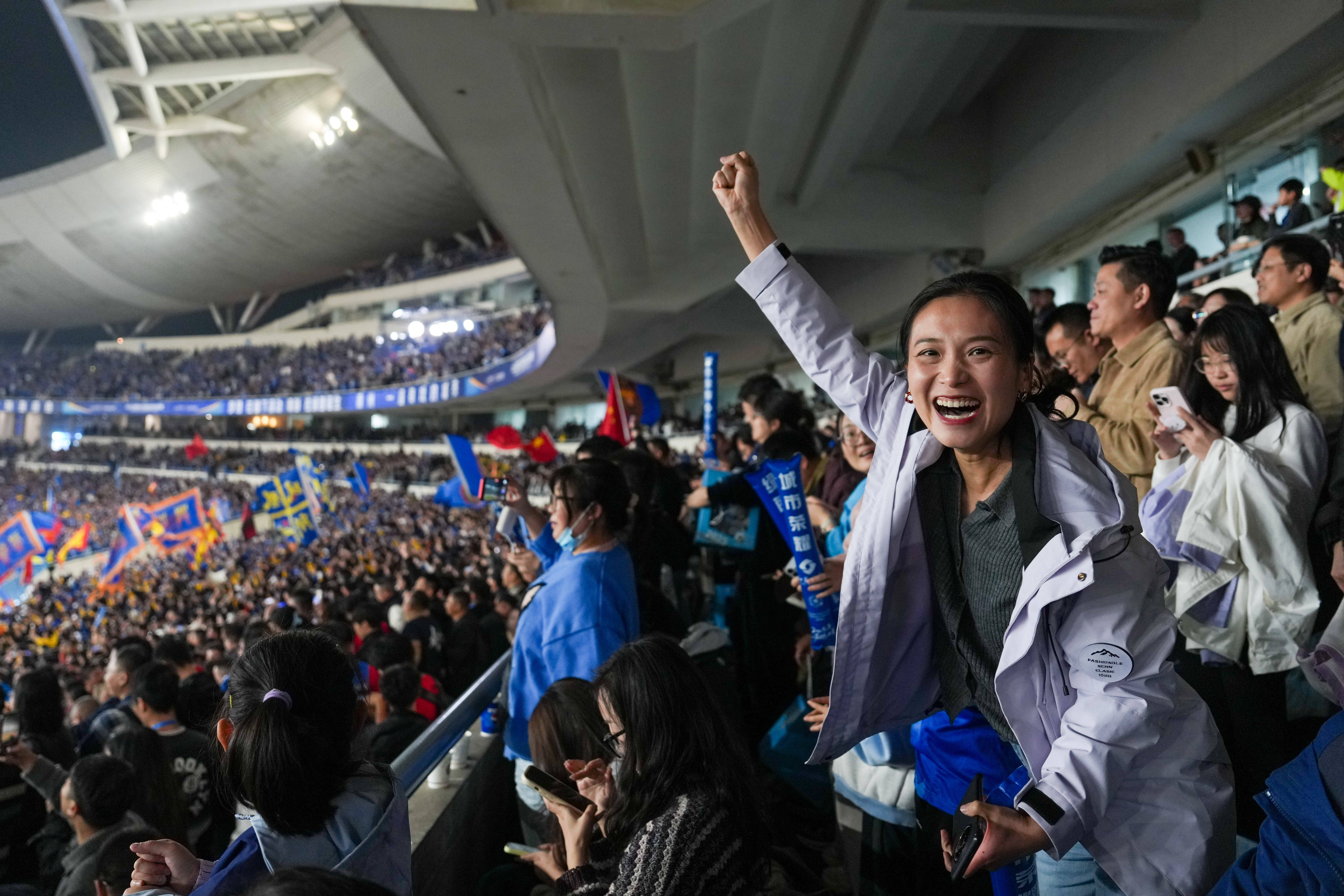 11月1日,球迷在江苏南京举行的2025江苏省城市足球联赛(“苏超”)决赛中加油助威。新华社记者 李博 摄创纪录引流量,赛事经济掀热潮